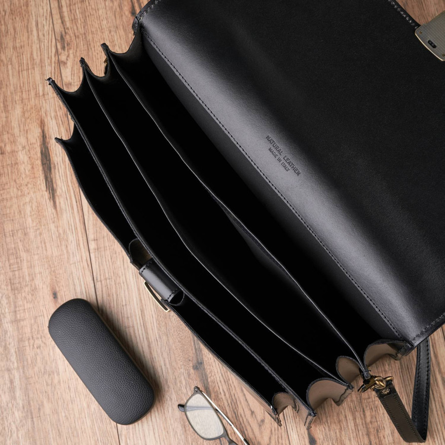 Wnętrze tej teczki aktówki męskiej zostało zaprojektowane z myślą o porządku. Trzy pojemne komory z przegrodami pozwalają logicznie rozłożyć dokumenty, akcesoria i sprzęt elektroniczny. Skórzana teczka na dokumenty męska N02 bez problemu mieści format A4, dzięki czemu doskonale sprawdza się jako aktówka męska A4 do codziennego użytku biurowego.