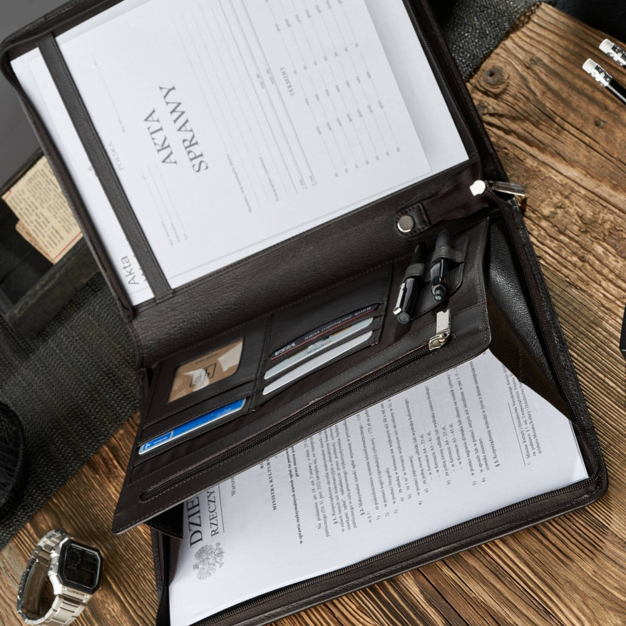 Oddzielna sekcja na dokumenty „do podpisu”, osobna na te „już załatwione”, miejsce na smartfona i drobne akcesoria – to sprawia, że Twoja aktówka na dokumenty staje się przenośnym biurem. Nie potrzebujesz biurka, by być gotowym do pracy. Wystarczy dowolny stolik w kawiarni, filiżanka dobrej kawy i Twój skórzany folder rozłożony przed Tobą.