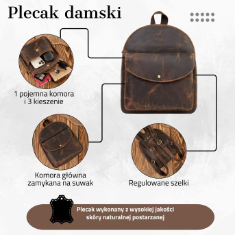 Po pierwsze, kluczowy jest materiał, z jakiego wykonany został model T-18. Jak wiesz, najbardziej trwałym surowcem jest skóra naturalna, dlatego postawiliśmy właśnie na nią. Dzięki efektowi postarzenia, ślady powstałe na skutek intensywnego, codziennego użytkowania nie są widoczne. Co więcej, dzięki zastosowaniu tego rodzaju skóry, plecaczek damski wydaje się być utrzymany w stylu vintage, co przypadnie do gustu miłośniczkom stylu retro.