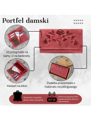 Czerwony portfel stał się ponadczasowym wyznacznikiem kobiecego stylu. Razem z czerwoną torebką tworzą modne połączenie, którym krytycy modowi zachwycają się od wielu sezonów. Postaw na duży portfel ze skóry naturalnej Paolo Peruzzi, którego oryginalne tłoczenia na froncie z pewnością spodobają się nie tylko kobietom w Twoim otoczeniu, ale również płci przeciwnej! Kwiatowe tłoczenia na froncie i materiał z efektem postarzenia nadają charakteru modelowi T-05. Czy staniesz się jego posiadaczką?