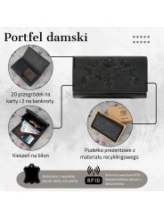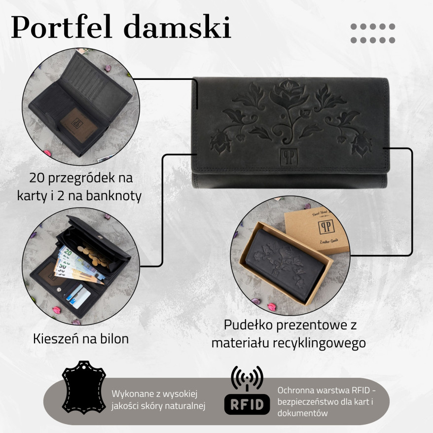 Kobiety lubią stawiać na dodatki, które wyróżniają się spośród innych oryginalnością i niepowtarzalnością designu. Paolo Peruzzi stworzyło duży portfel damski ze skóry naturalnej, który dzięki kwiatowym tłoczeniom na froncie jest nietuzinkowym akcesorium galanteryjnym dla stylowej kobiety. Bądź świadoma swojego stylu i postaw na klasyczny fason z odrobiną nowoczesności! Czarny portfel zawsze pozostanie uniwersalny – w połączeniu ze skórą naturalną vintage stanie się nieprzemijalnym dodatkiem noszonym przez lata!
