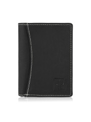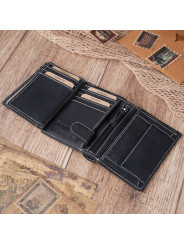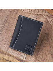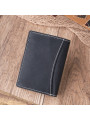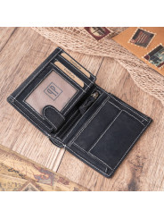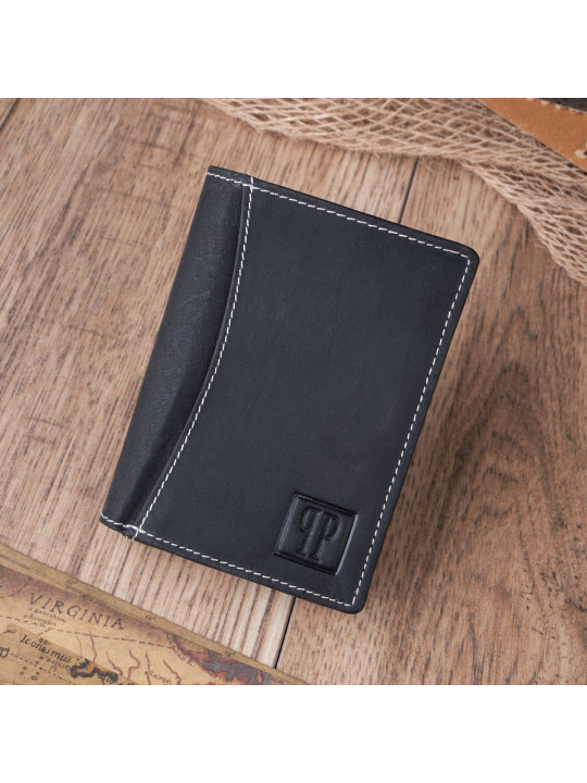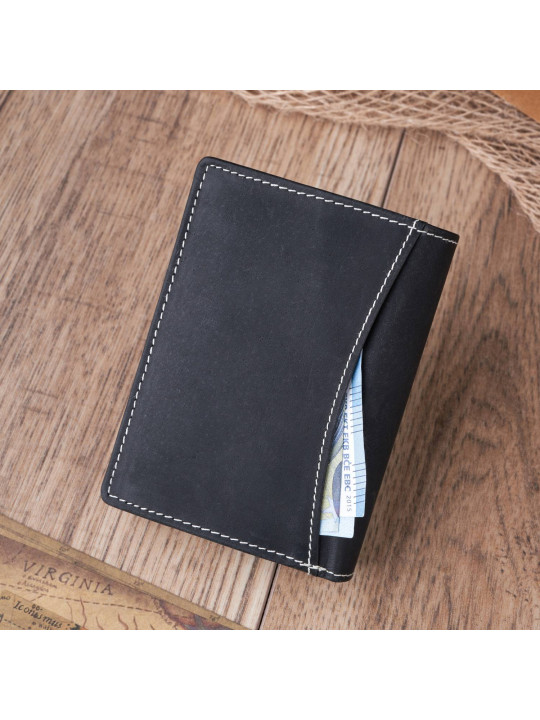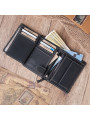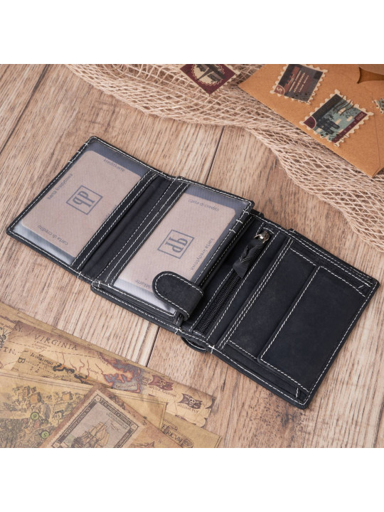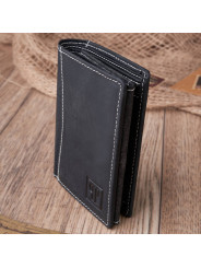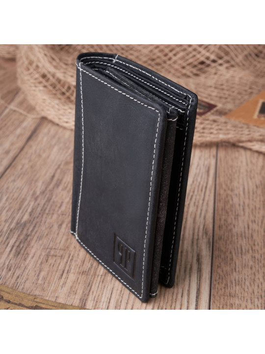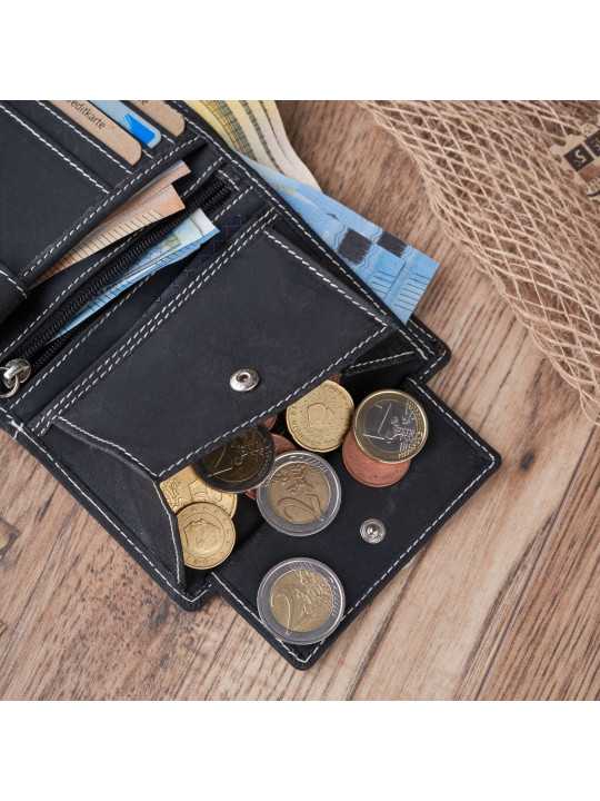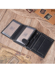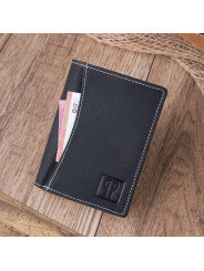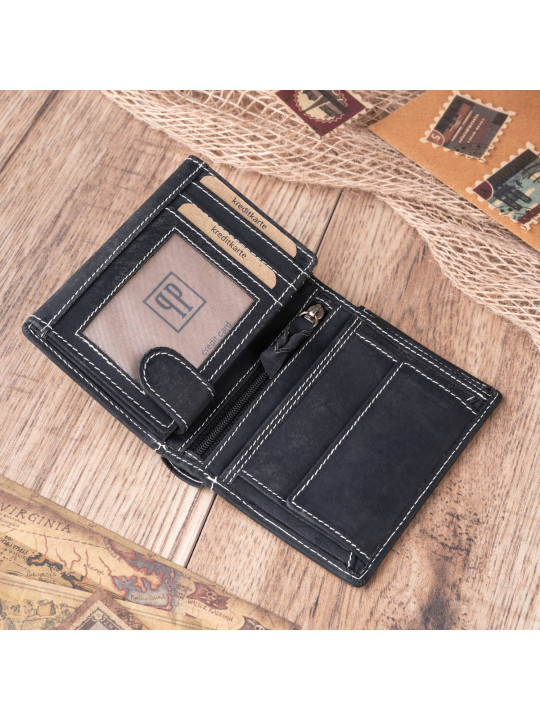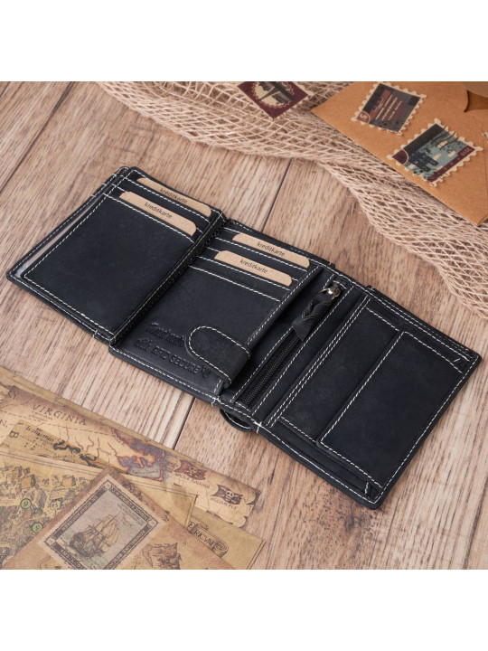 Czarny skórzany portfel wykonany z mocnej skóry naturalnej retro. Na zewnątrz portfela znajdują się dwie duże kieszenie wsuwki, które świetnie sprawdzą się jako schowek na często wyciągane dokumenty lub karty. We wnętrzu znajdziesz: kieszeń na bilon oraz pionową kieszeń na suwak. W portfelu umieszczono 9 miejsc na karty kredytowe, dwie przezroczyste przegródki oraz ukryty schowek, a także podwójną przegrodę na banknoty. Portfel cechuje solidna konstrukcja – dla przedłużenia żywotności obszyliśmy go mocną nicią kaletniczą. Akcesorium zawiera ochronną membranę RFID