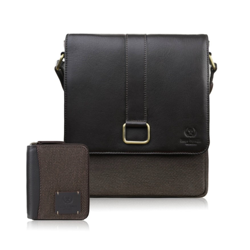 Elegancki zestaw męski Paolo Peruzzi – torba na ramię i portfel wykonane z naturalnej skóry oraz bawełnianego canvasu. Stylowe, praktyczne i trwałe akcesoria idealne na co dzień lub na prezent.